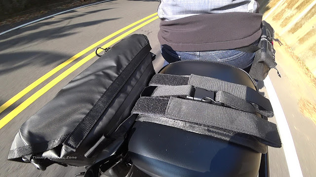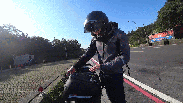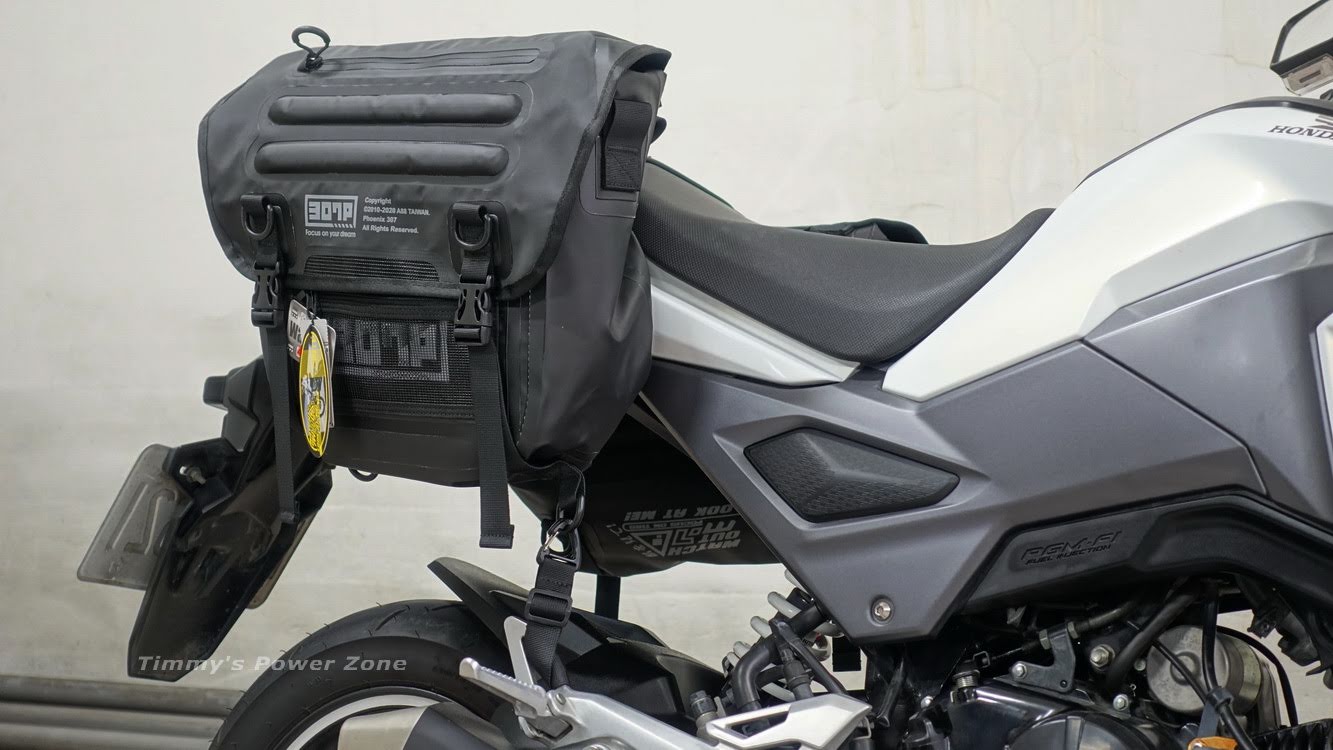 ↓由於我的Z900RS只有單側有裝馬鞍包支架(防止包包捲入後輪),所以只有裝單側;我也挺怕會因為兩邊重量不平衡而會滑動。沒想到效果出乎意料的超超超好!我裝了空拍機、相機、腳架...等,約2.5~3kg(官方資料單側限重3kg),騎了5km的山路,從頭到尾都穩穩的黏在側邊,效果真是非常滿意!