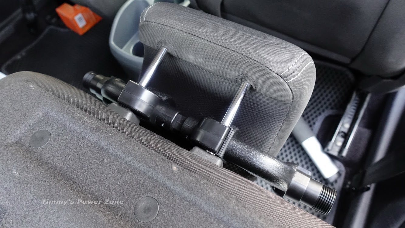 ↓接著穿過車上頭枕的固定桿,兩邊同時將彈簧往內壓,就可以輕鬆固定在頭枕支架上了