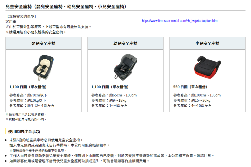 一直沒有什麼機會試用增高墊,在去年全家京阪自由行的行程剛好排入自駕遊琵琶湖的行程,日本對於交通規定一項很嚴謹,在租車的選項就有告知若車上有幼兒乘坐,必須安裝安全座椅,不然是可以拒租的。(參考Times租車規定)