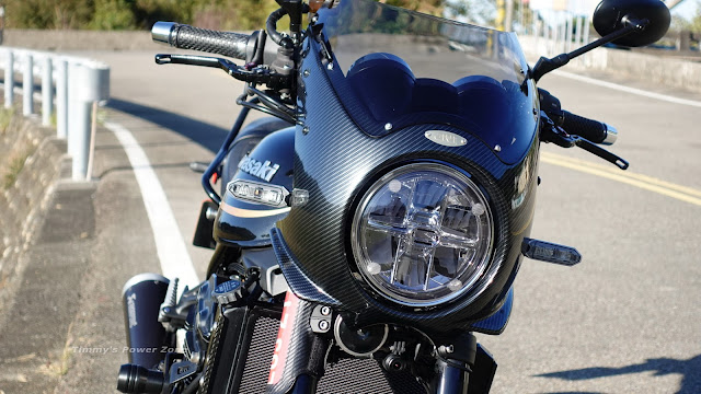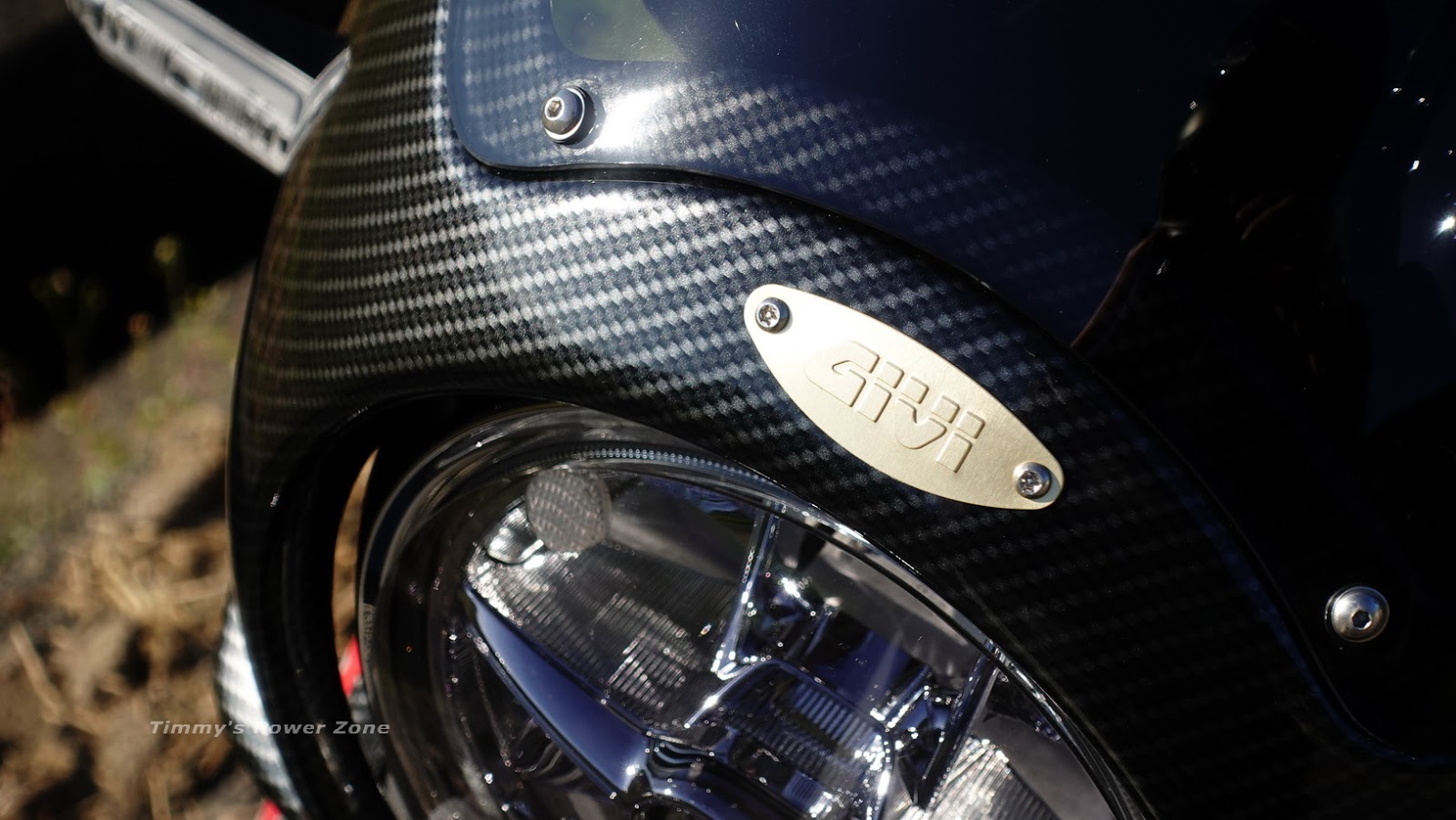 ↓相較於GIVI頭罩原本低調穩重的消光黑,貼了亮面碳纖維花紋後,光線照射下閃閃發亮