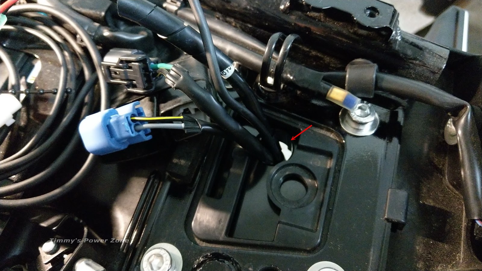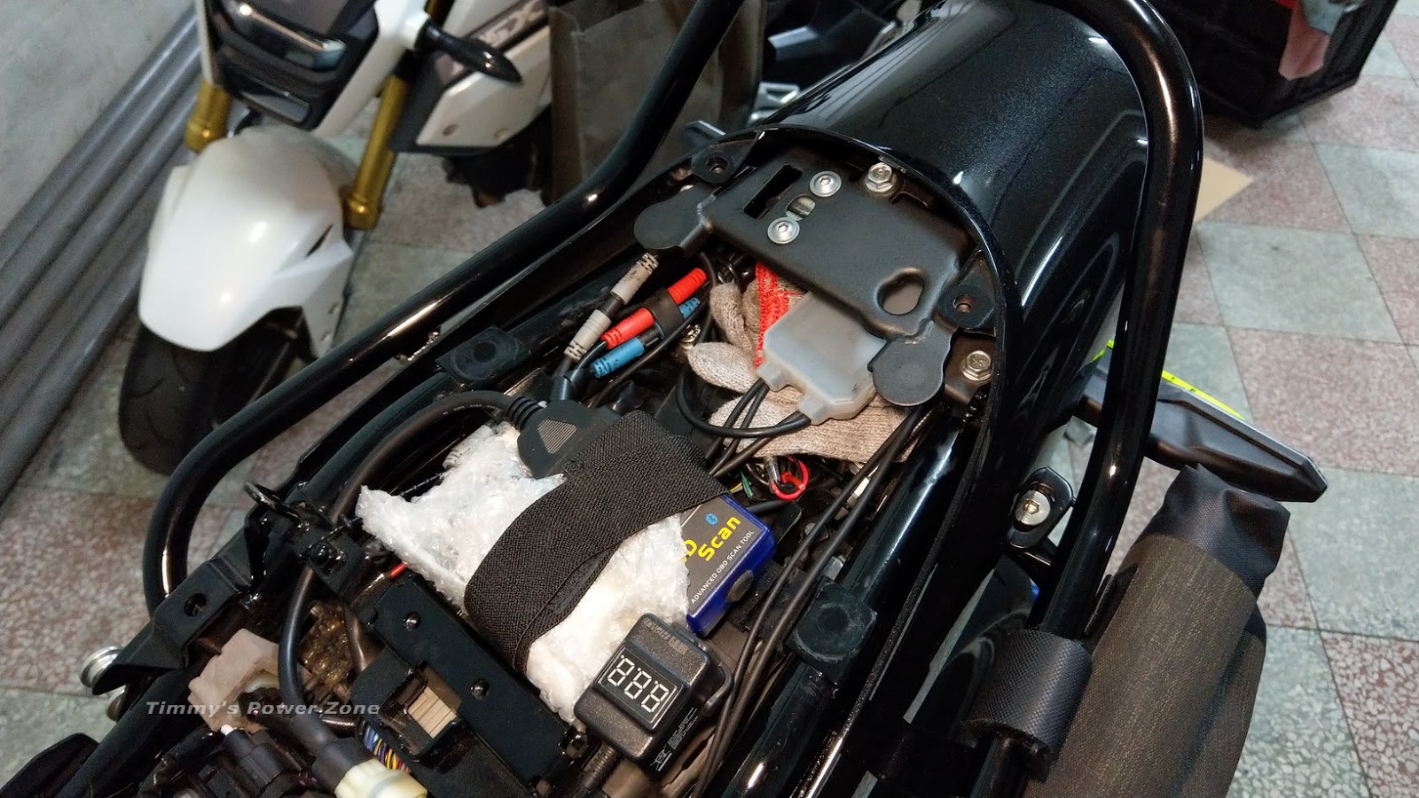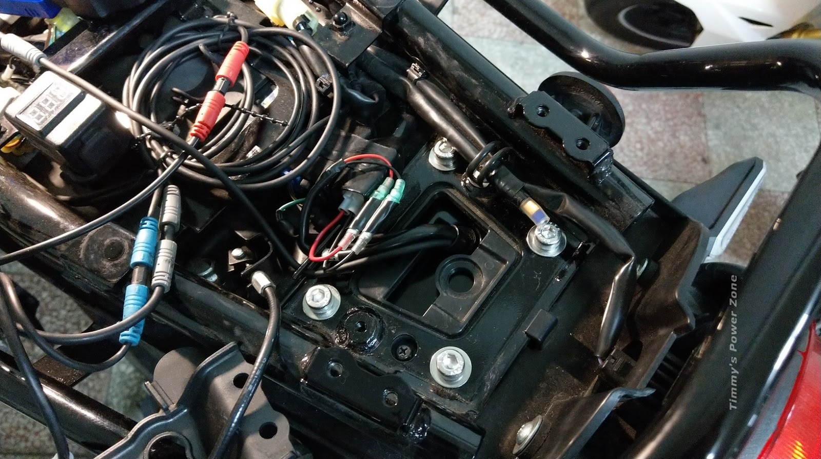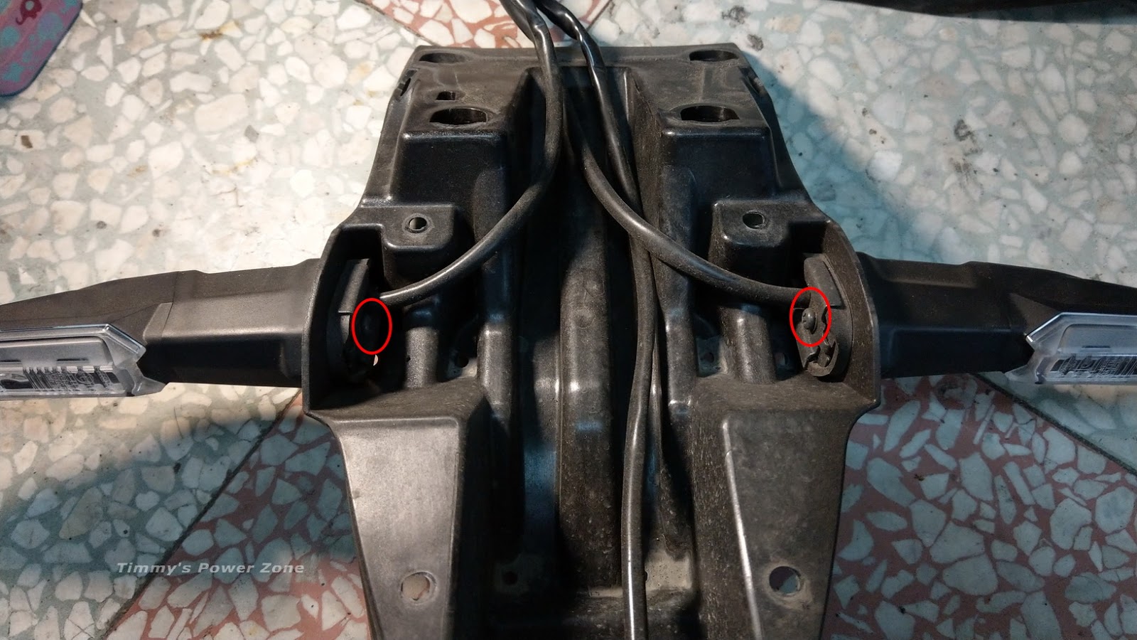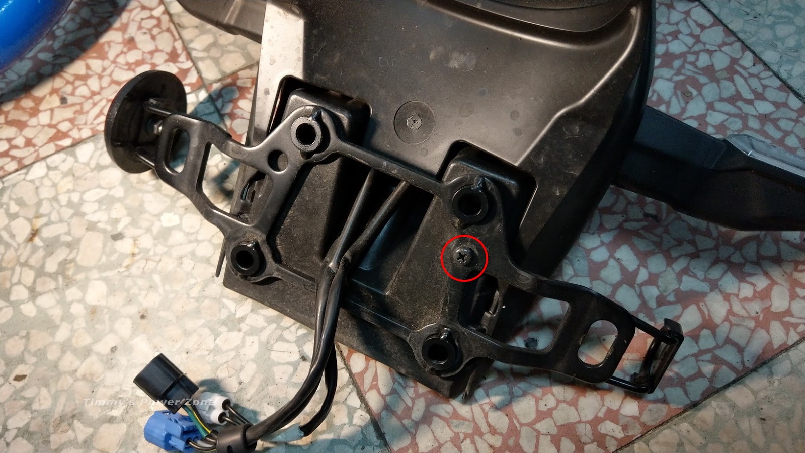 ↓卸下座墊鎖這片支架,就可以開始拆土除的螺絲了。拆螺絲之前記得把方向燈跟牌照燈的電源線拔掉(3個箭頭處)。
