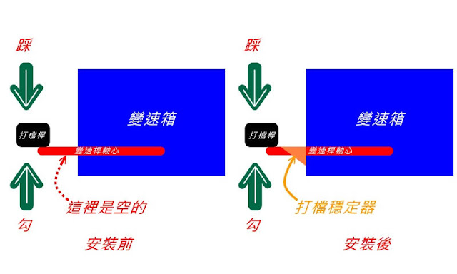 ↓它的原理其實很簡單,就是多一個機構幫你托住打檔變速桿的軸心而已。