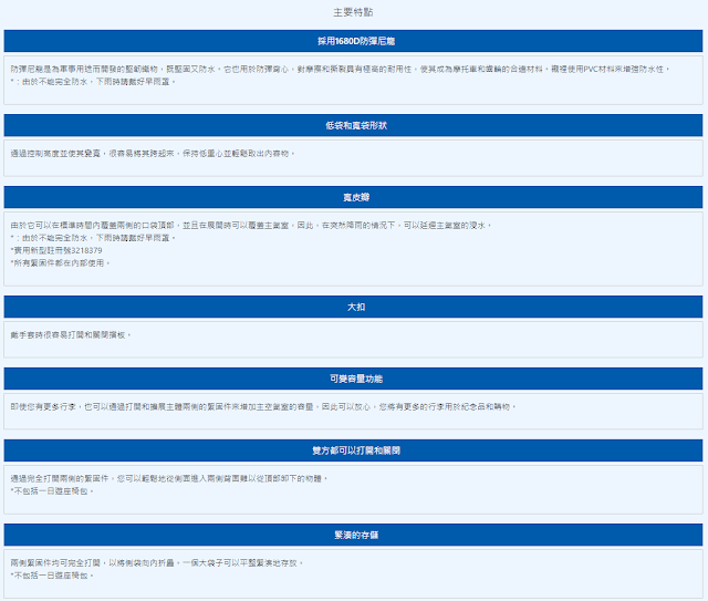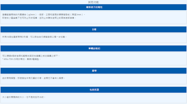 ↓總之,我大概有些感到興趣的選擇,可以跟大家分享。我個人最喜歡的日本品牌TAICHI,這款就蠻好看的,容量有32L。但是它固定的方式是綁在椅墊上,這點我經歷了先前的失敗經驗,就先pass了,雖然我蠻喜歡它的造型。
