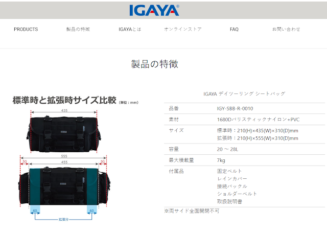 ↓後來看到這一篇,這是很冷門的品牌『IGAYA』,一樣是可擴充性的後座包,空間比前面的MFK-100又更大了,固定方式是綁在車子的行李固定點上,外型跟機能都不錯,售價更是超值,定價直接在¥10,000以下!(對照MFK-100定價是¥15,600)