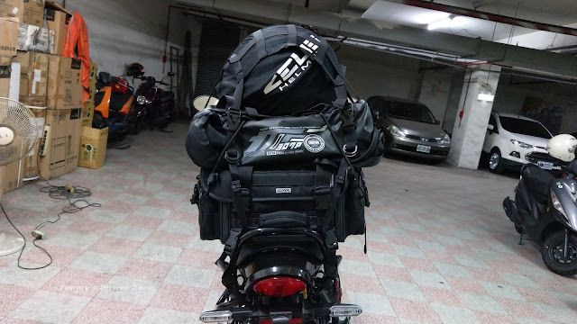 ↓覺得20-28L還不用嗎?先前開箱的307 PX-5 PRO MK2背包剛好可以綁在IGAYA座墊包上,再加上PX-5的安全帽網袋直接合體成個小山了!