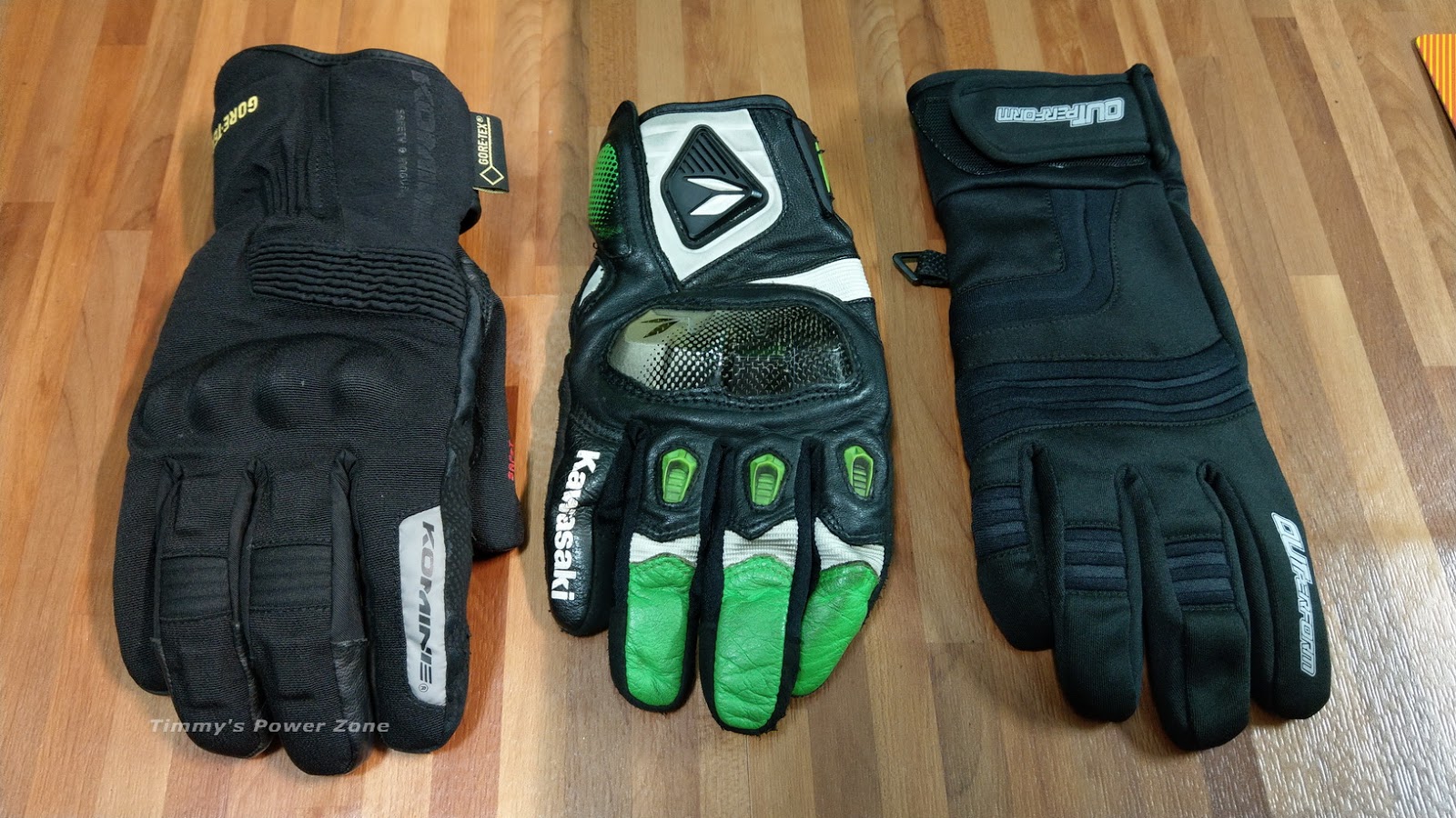 ↓拿了冬天戴的手套來試試,左到右是Komine的防水防寒騎士手套、Taichi的冬季騎士手套、奧德蒙的防風防水手套。中間Taichi的直接打槍,因為太合手了,再加上內手套就真的太緊了,看來要穿戴比較好的騎士手套可能要放大一個尺碼。
