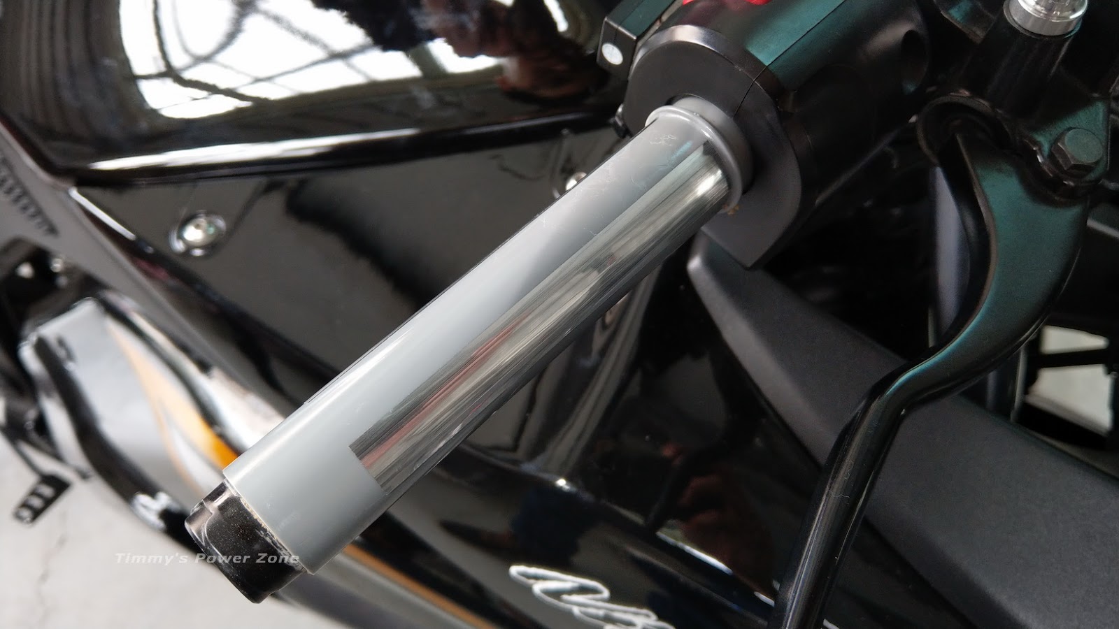 ↓握把套很有質感,材質偏硬,但握起來質感不錯,不會滑。不過沒帶手套的話,我覺得有點硬,長時間用可能會覺得刮手。120mm有點短,所以油門側看到縫隙蠻大的。130mm太長,油門轉動會卡卡的。