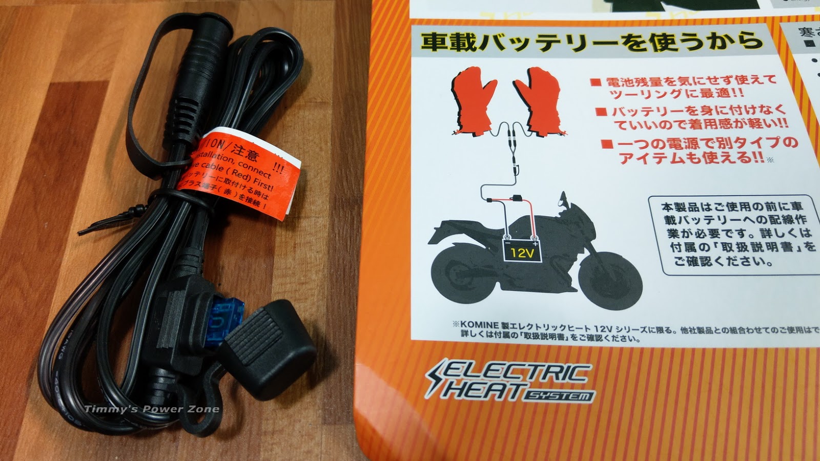 ↓電源線,有分2段,下圖這是連接電瓶的那一段,沒有附開關,如果要車上電源連動的話要自己接線。另外一段是接到手套那段的1分2電線。