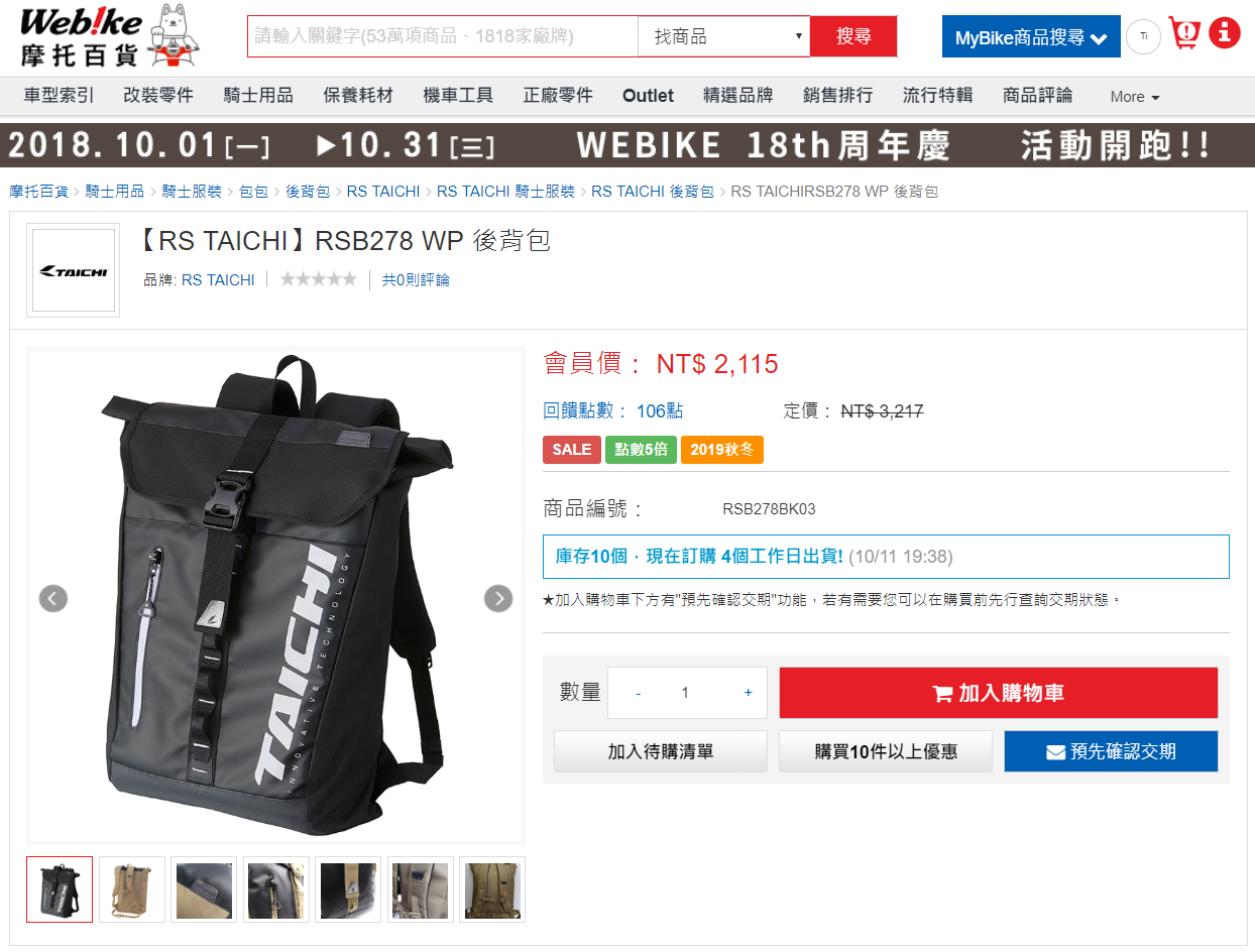 我在Webike剛開始販售此背包的時候就一見鍾情,但當時價格售價為$3,xxx,下不了手;沒想到國慶假日這段期間竟降了價格(→$2,115),手上累積的點數有1000多點,折抵後花不到一張小朋友,立馬下單!